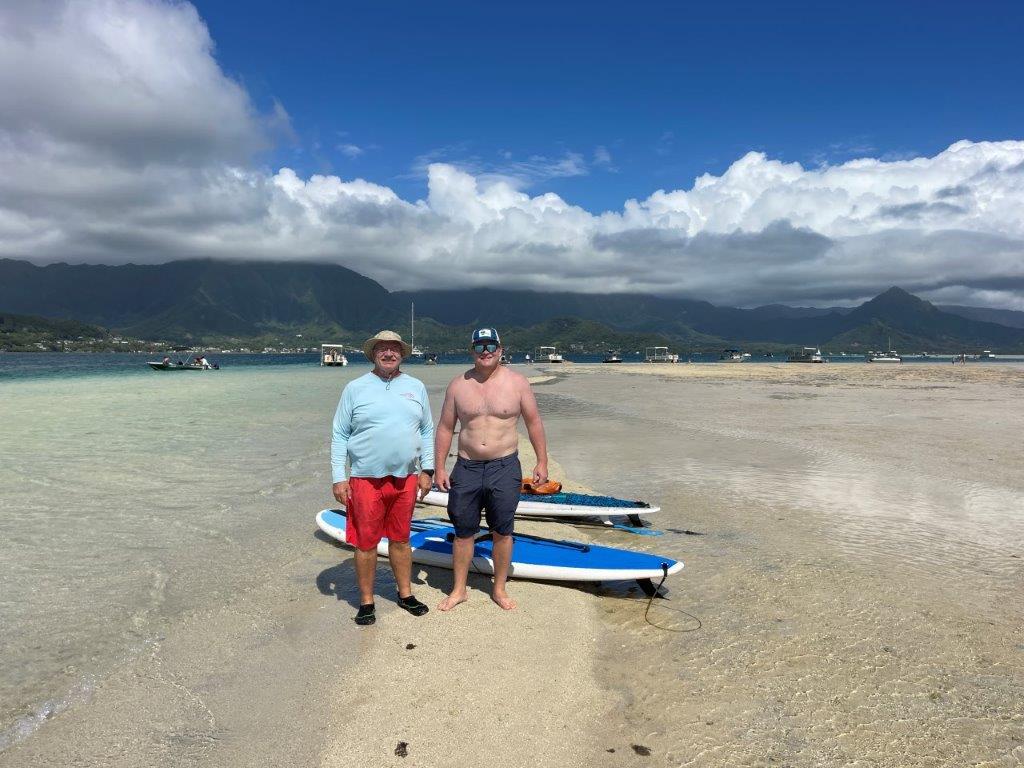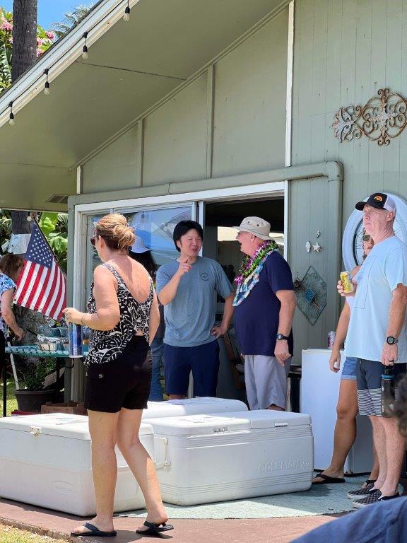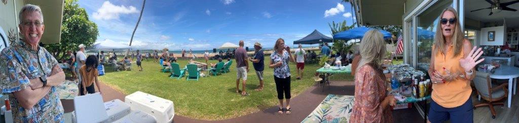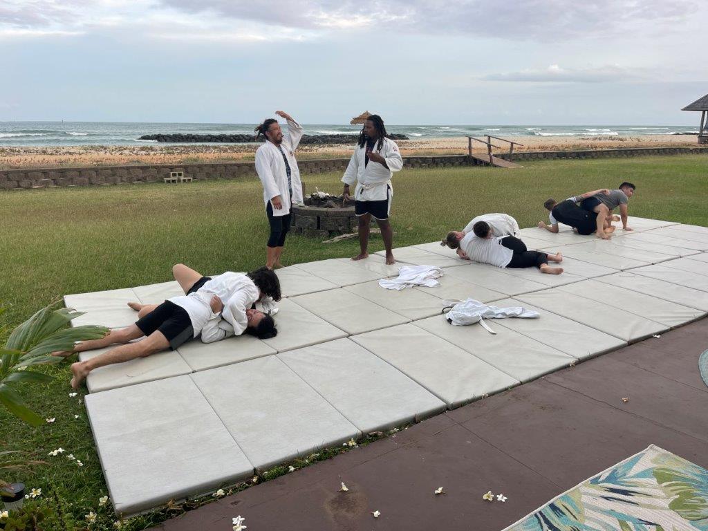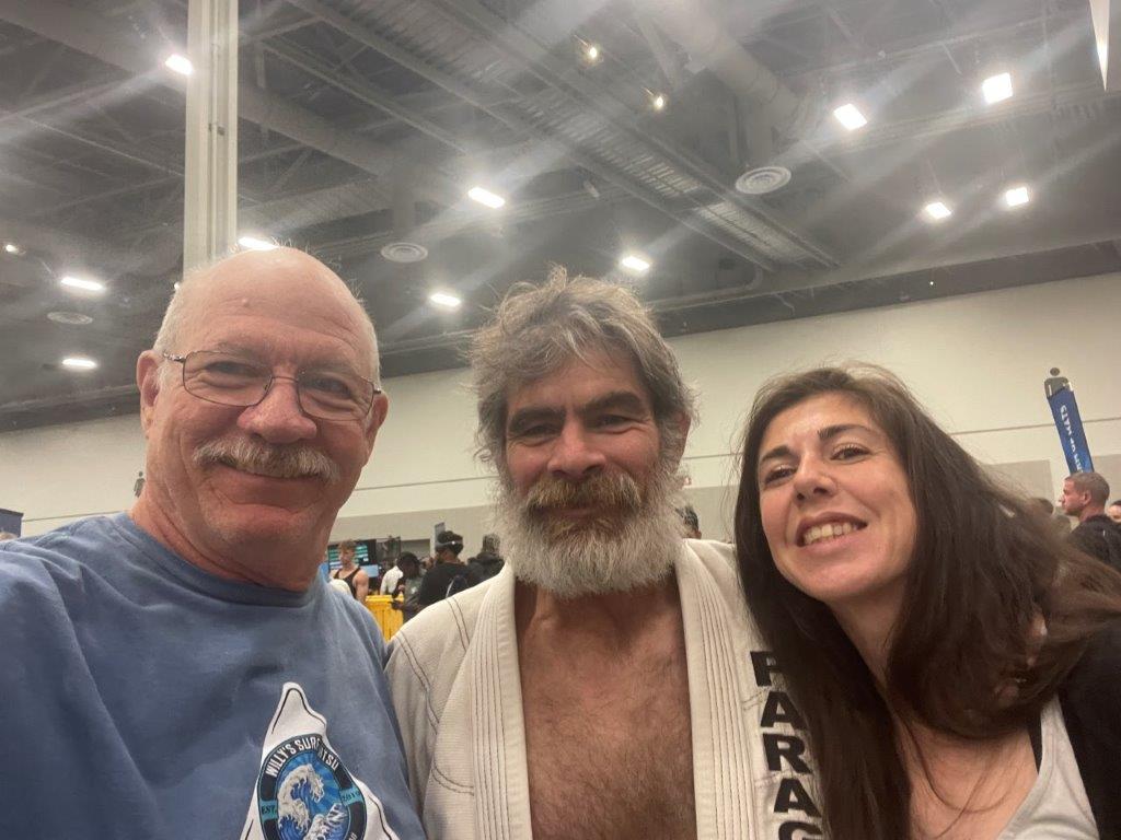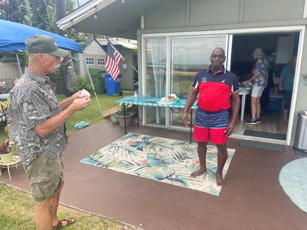 Willy retired in May! Hopefully this one lasts. There was a celebratory event at Willy and Deannas home with food, a band (Chain Reaction) and 125 guests! The event lasted about 12 hours, from the time the sunrise surfers arrived until evening when the last visitors left. About half the guests were Willys co-workers, and half were from the community. Dave and Brenda Gleason came to witness it, and the big surprise was Kirks attendance. Deanna woke Willy up from napping, and said there was someone here that wanted to train Jiu-Jitsu. Kirk was wearing a hat and sunglasses, so when Willy came around the corner to greet him, he did not recognize him and introduced himself. Kirk explained that it was not necessary to introduce himself to his son!